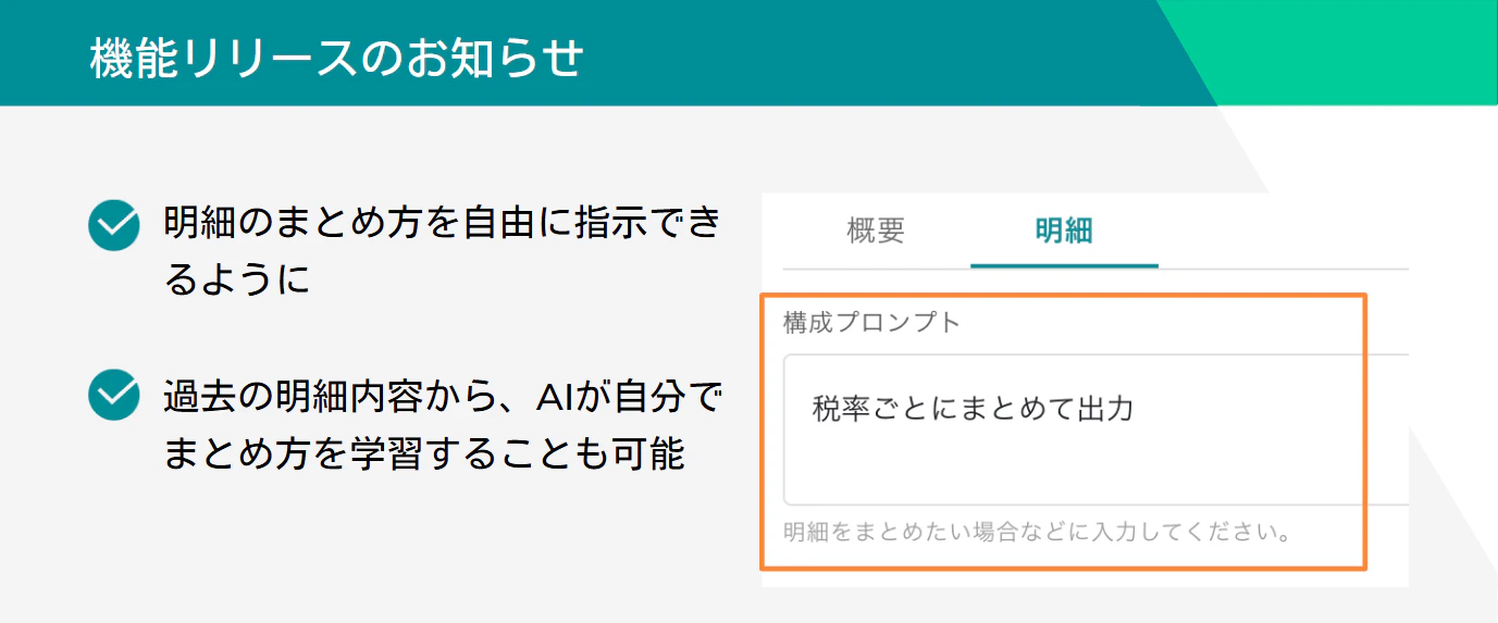これにより、自社の仕訳ルールや計上の方針に合わせて自動で合算した状態で、明細データ化が可能になりました。