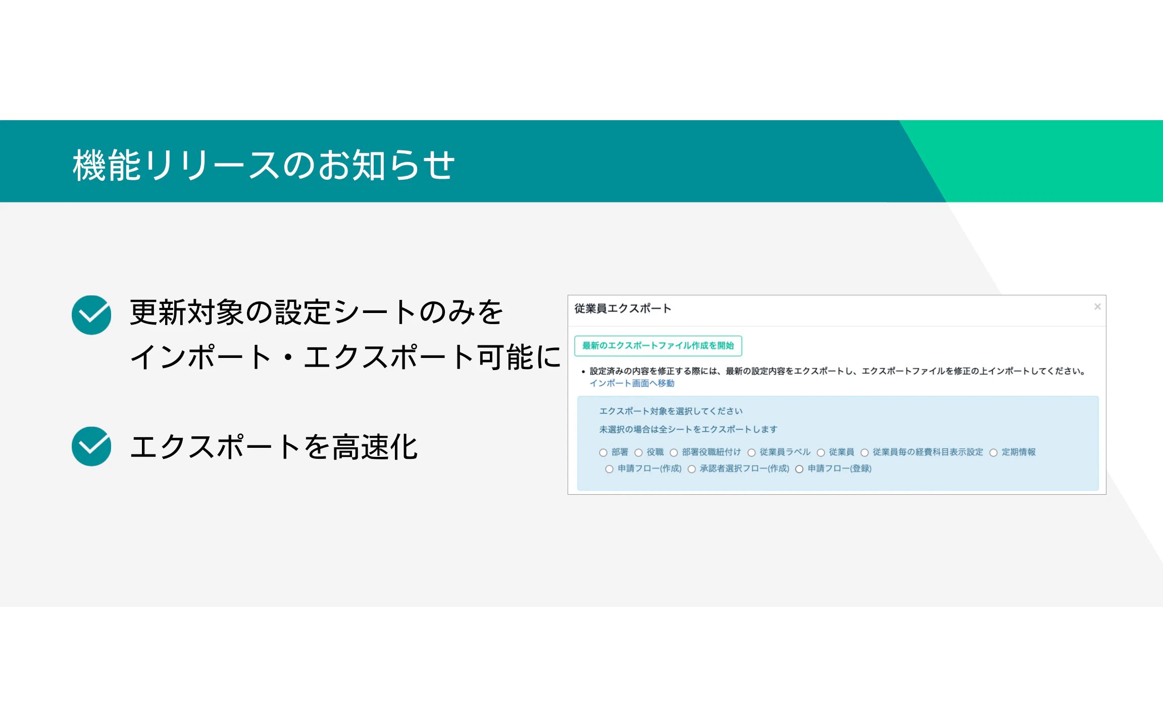 システム設定>従業員のインポート・エクスポート画面で、対象のシートだけを選択して登録や出力ができるようになりました。