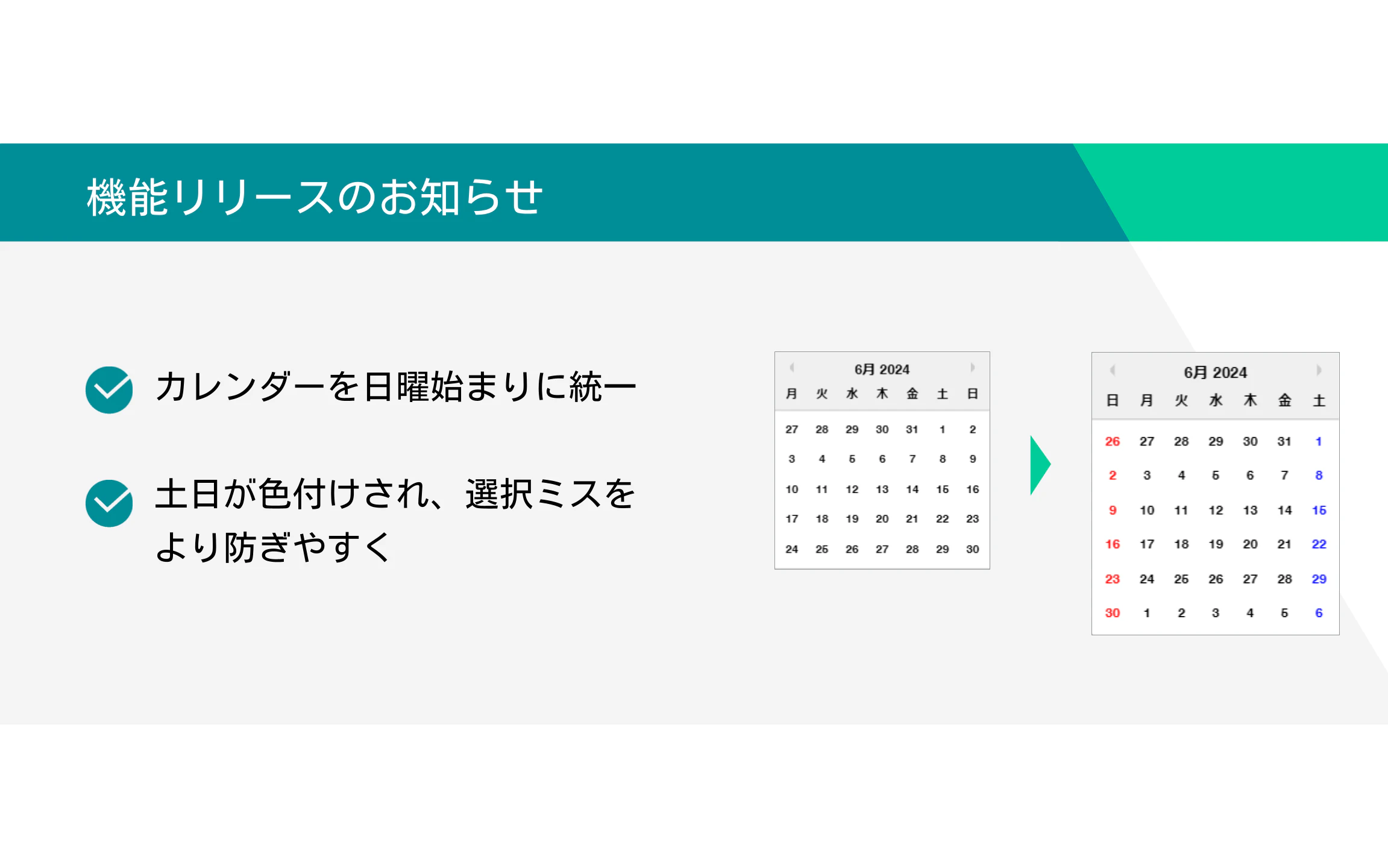 この度、全ての画面のカレンダーを日曜始まりに統一いたします。
