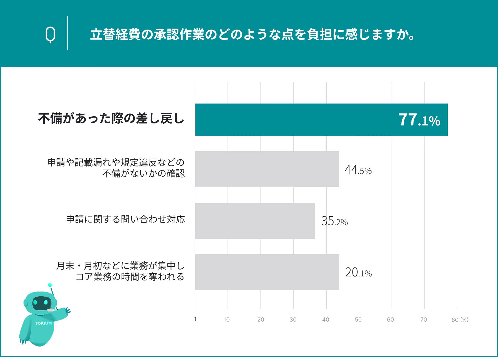 そして、差し戻し業務は、実際に承認担当者の大きな負担になっています。73.9%の承認担当者が経費承認作業を「負担に感じる」と回答しており、その最大の要因は「不備があった場合の差し戻し」(77.1%)であることが明らかになりました。