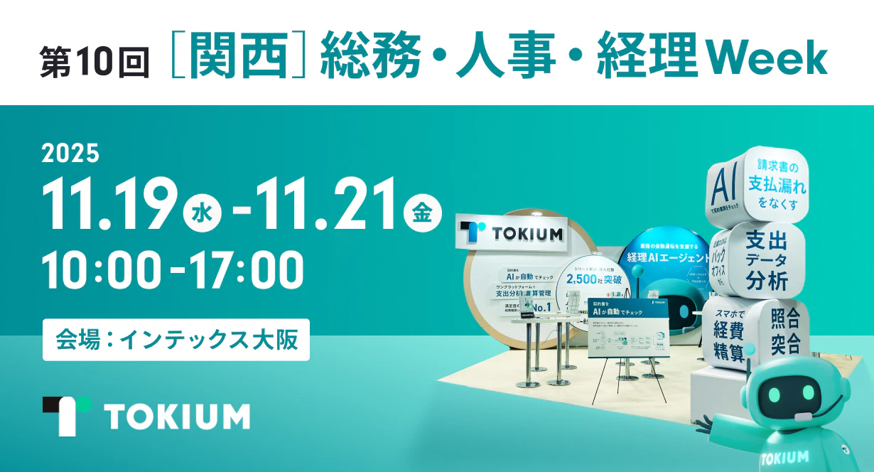 経理AIエージェントを提供する株式会社TOKIUM(本社:東京都中央区、代表取締役:黒﨑 賢一、以下「TOKIUM」)は、2025年11月19日から11月21日までの3日間、インテックス大阪で開催される第10回 [関西] 総務・人事・経理 Week内の「会計・財務 EXPO」と「法務・コンプライアンス EXPO」に出展いたします。